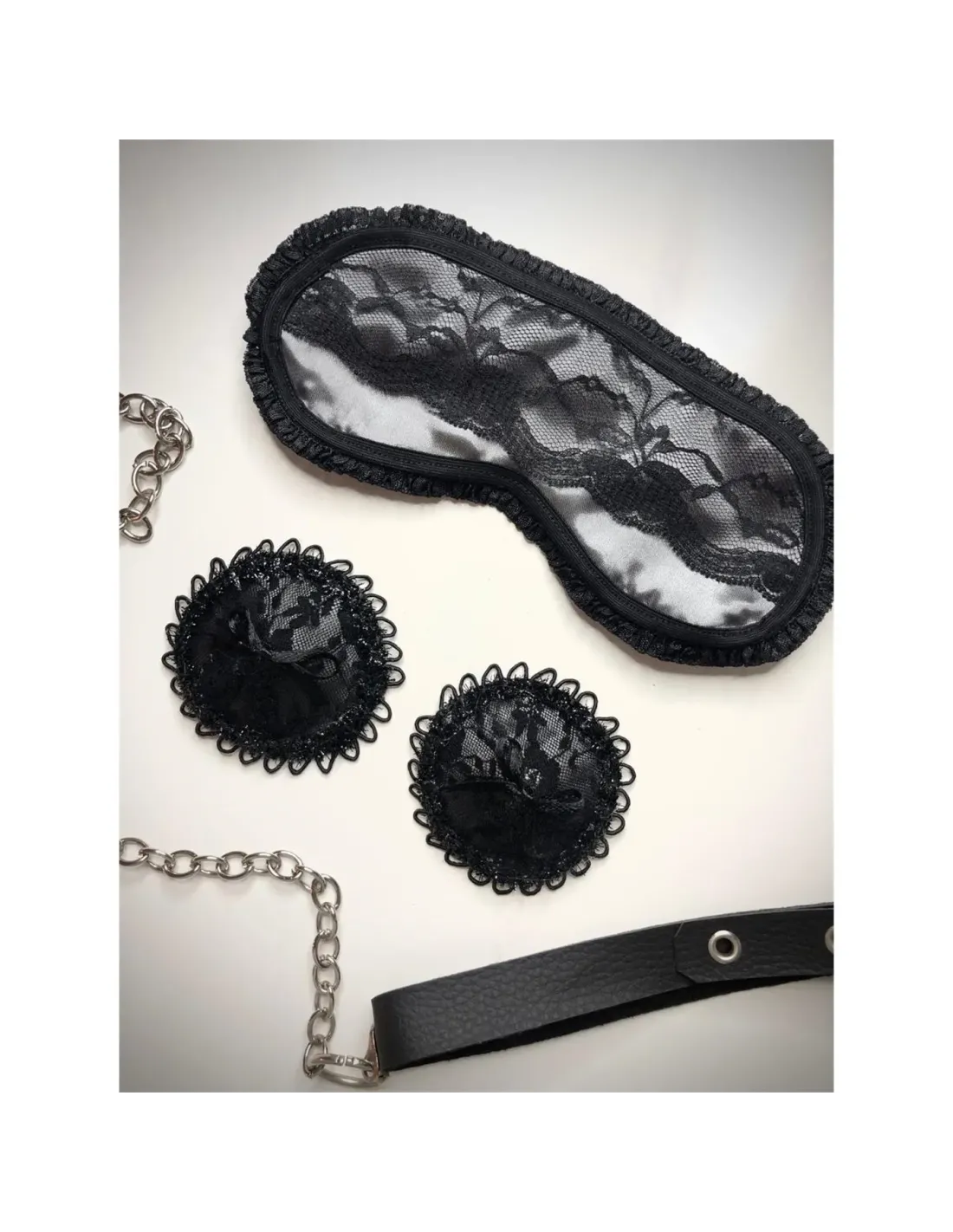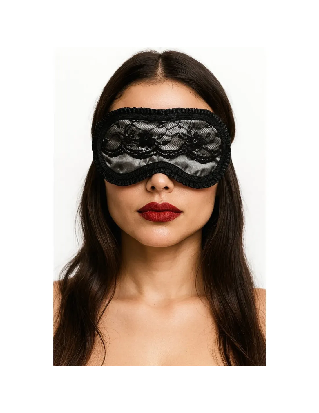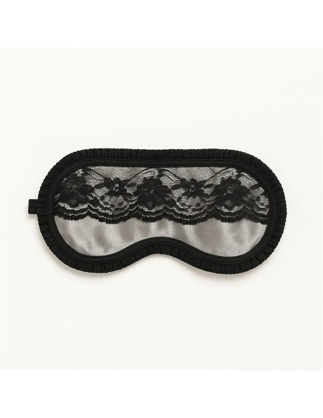 Antifaz realizado en confección de raso y detalle de puntilla en el contorno.