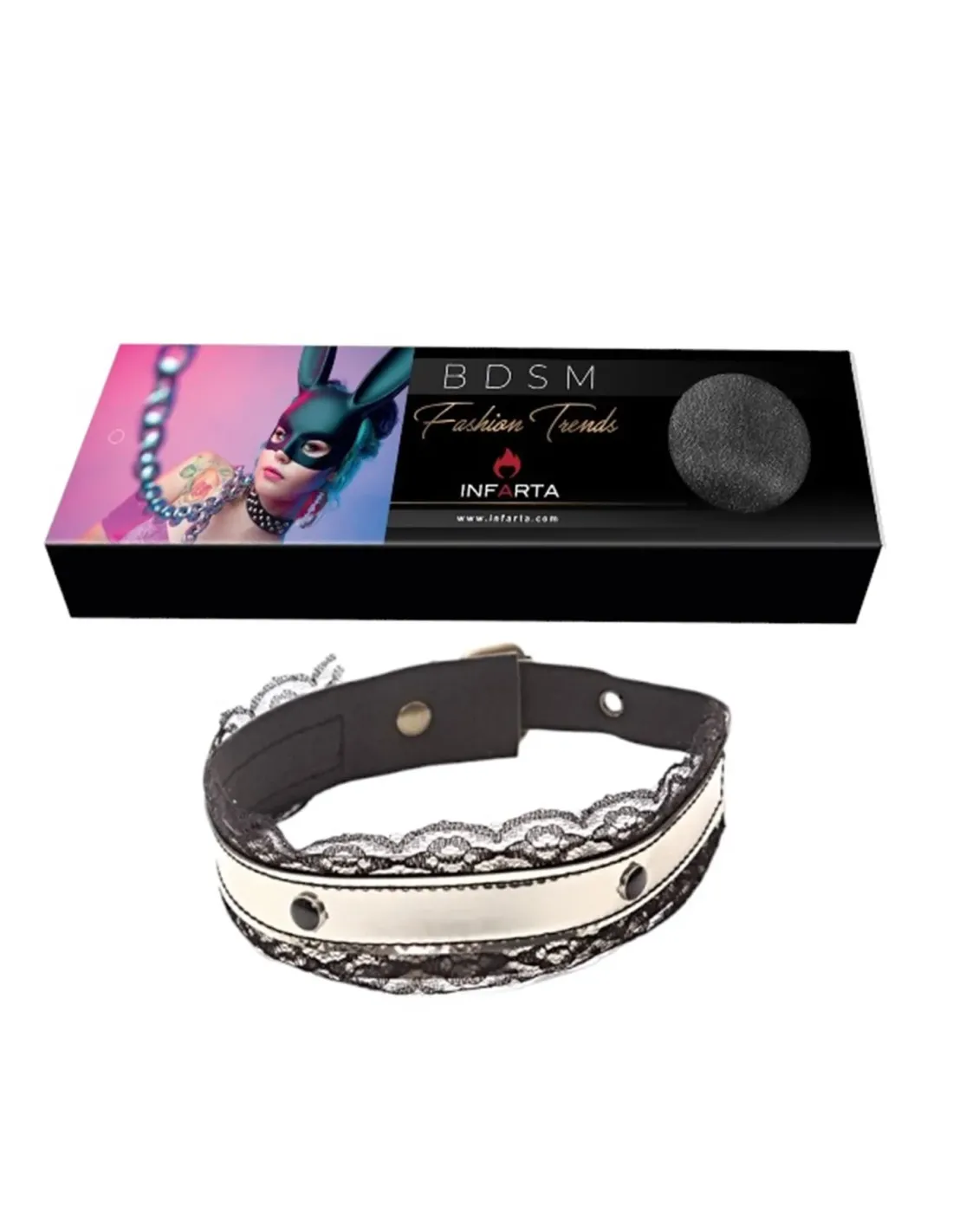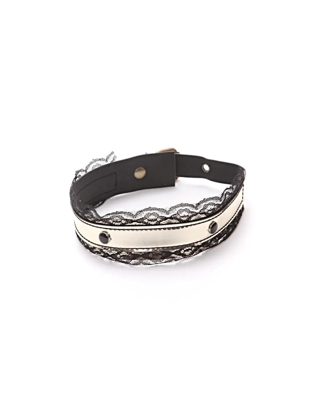 Nuestra atractiva gargantilla está conformada por materiales como puntilla, tachas con borde metálico y hebilla metálica de bronce viejo.