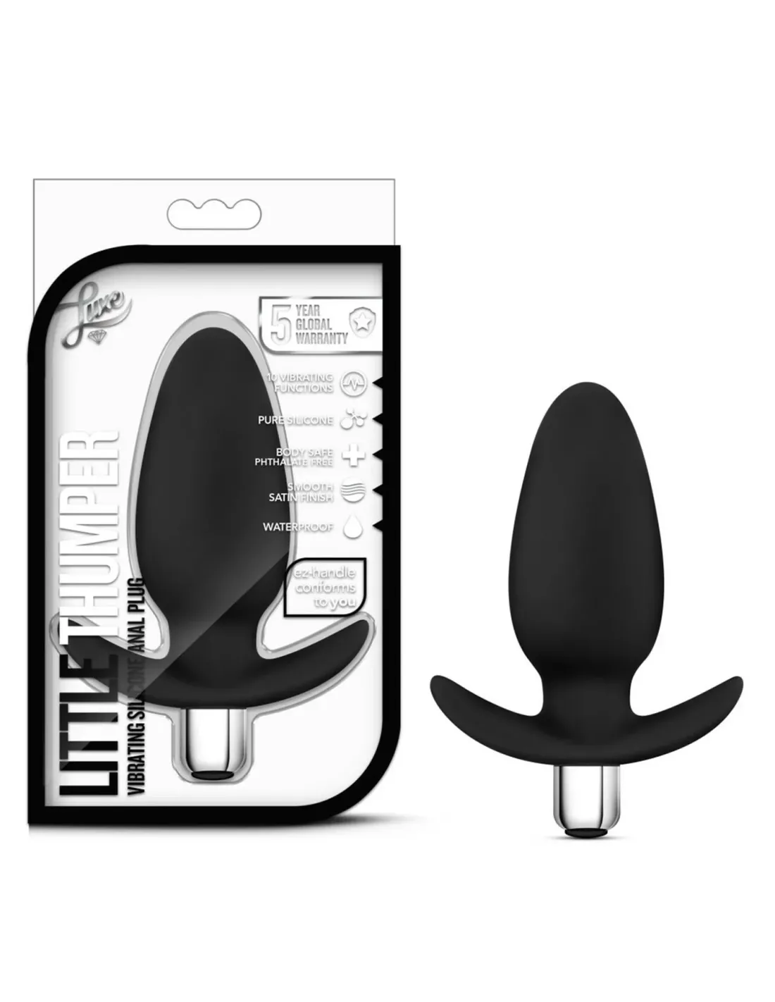 Little Thumper es una nueva edición de nuestra colección de tapones anales. La bala vibratoria cuenta con 10 funciones de vibración que constan de 5 velocidades y 5 ritmos. Esta bala impermeable también es extraíble, por lo que puede usarla sola o junto con el enchufe. ¡Entonces tienes 2 juguetes en 1! Una nota sobre la forma de este producto. La cabeza y el cuello del enchufe tienen una forma que cuando se inserta el enchufe permanece insertado de forma segura. El mango tiene una forma que se adapta cómodamente a su cuerpo, lo que hace que el uso prolongado sea más cómodo. El Little Thumper está hecho de silicona pura, por lo que es seguro para el cuerpo y no contiene ftalatos.